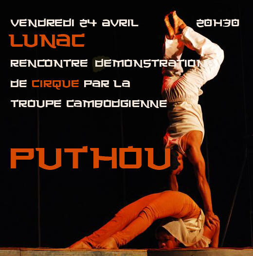 Vendredi 24 Avril 2009 à 20h30 Salle polyvalente de LunacEntrée libre et gratuite Rencontre & Démonstrations de Cirquepar la troupe cambodgienne de PUTHOU