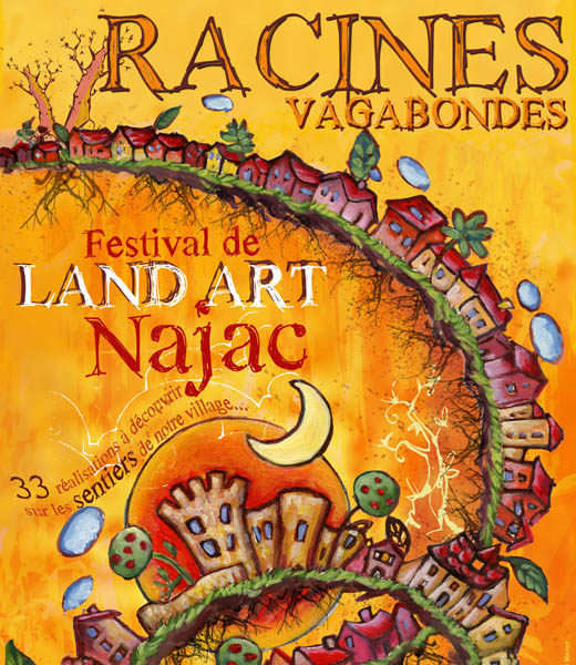 Portée par l’association Najac Paradise (éditrice de Najac Tribune), la 1ère édition du festival de LAND ART "Racines Vagabondes" aura lieu à Najac, du 21 juin au 22 août 2009. Pendant ces 2 mois, un sentier artistique balisé invitera le promeneur à découvrir les réalisations de najacois créatifs ou celles d’artistes plus lointains. Bois, pierres, osier, végétaux, terre crue… un hommage à la nature et à ses éléments, déstructurés, revisités, remodelés, pour questionner, étonner, amuser.