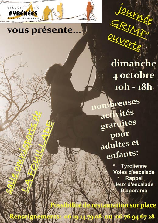 Comme chaque année le club d'escalade et de randonnées "Villefranche Pyrénées"' vous invite à sa journée portes-ouvertes, dimanche 5 octobre 2009 de 10h a 18h à la salle omnisports de La Fouillade. Nul besoin d'être expérimentés pour venir ,cette journee est faite pour tous, les initiés comme les autres (ceux qui n'osent pas). Alors osez, le club s'est mis en quatre pour vous! Au programme: