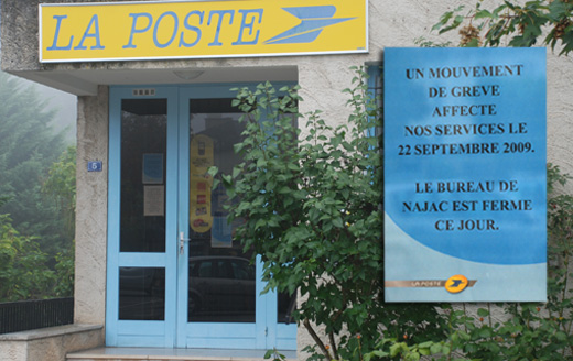 Le 22 septembre, le bureau de Poste de Najac sera fermée pour cause de mouvement de grève.En effet, le 29 juillet dernier, le gouvernement adoptait en conseil des Ministres un Projet de loi visant à modifier le statut de La Poste, projet qui devrait être examiné au Sénat puis à l’Assemblée nationale dans le courant de l’automne. Syndicats, usagers et salariés craignent que ce changement de statut ne constitue que la première étape vers la privatisation pure et simple du service public postal.Les populations rurales ont déjà eu a déplorer les choix fait ses dernières années par la direction de La Poste, le plus souvent au mépris de ses usagers et/ou des salariés: fermetures de bureaux de Poste dans certains cas, réduction des activités sur les territoires jugés moins rentables.A noter également que de nouveaux horaires d'ouverture du bureau de Najac sont affichés, qui entreront en vigueur dès le 5 octobre prochain: ouverture les matins uniquement, du lundi au vendredi de 9h à 12h15 et le samedi de 8h30 à 12h15 (soit 20h d'ouverture hebdomadaire contre 24h pendant la période estivale).